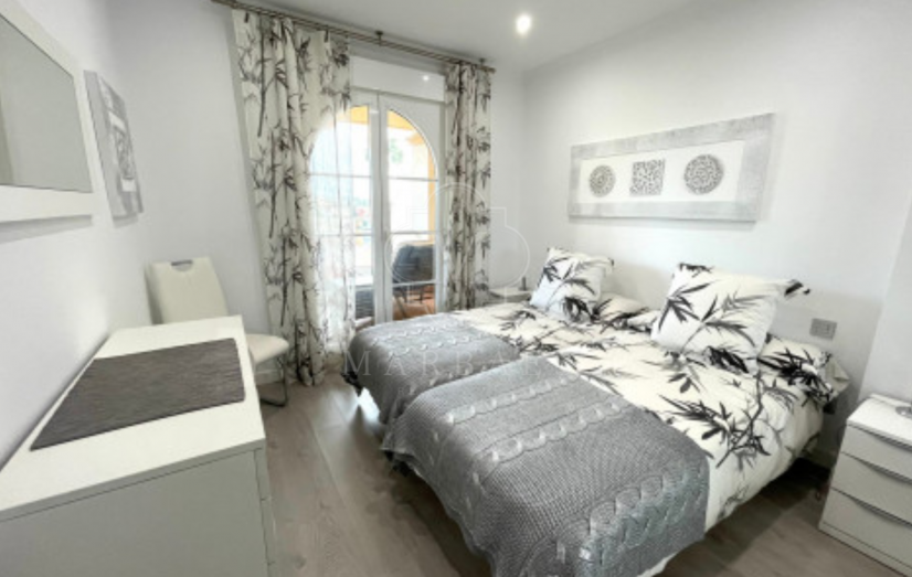 The apartment features a bright open-plan living and dining area that connects seamlessly to the street-facing terrace, ideal for enjoying Marbella’s year-round sunshine and views of the lush communal gardens. The fully equipped kitchen provides modern convenience, while the two spacious bedrooms include built-in wardrobes, with the master suite offering direct access to the terrace.