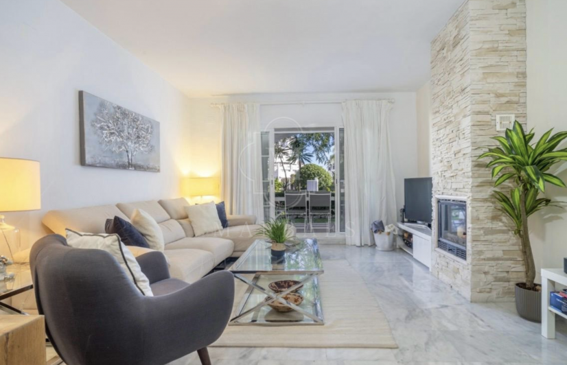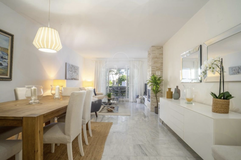 This ground floor apartment is situated in the exclusive Las Adelfas development, located in the sought-after area of San Pedro de Alcantara, Malaga, on the renowned Costa del Sol. Offering direct access to the beach and set within a prestigious gated community boasting 42,000m² of frontline communal gardens. With a built area of 185m², including 146m² of refined interiors and a 15m² private terrace, and a small enclosed garden, ideal for small pets, the apartment seamlessly combines spaciousness with comfort. Price indicated is for the period from September to June, the property can also be rented for the entire year.