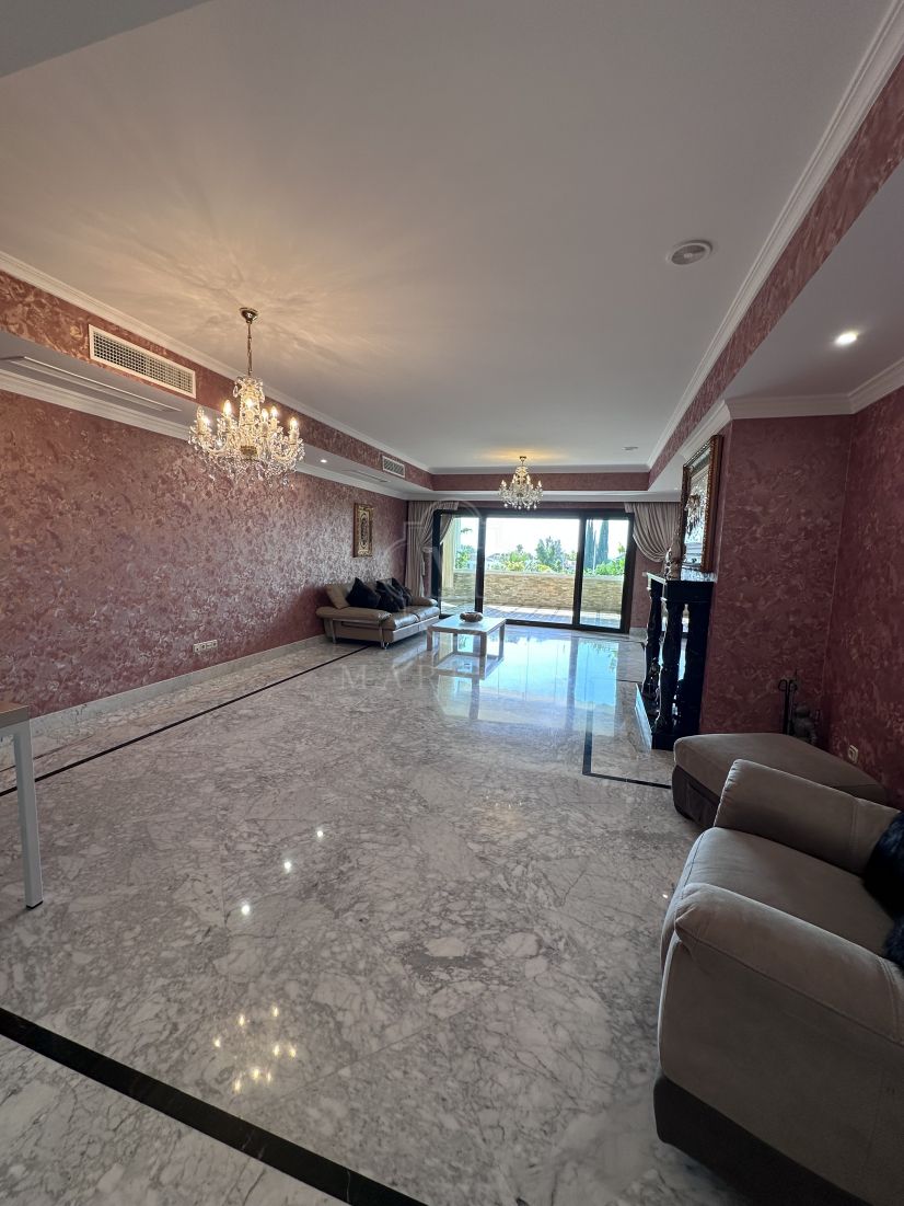 Apartamento en venta en Marbella Golden Mile, Marbella con 4 dormitorios, 4 baños, 4 baños en suite, 1 aseo y con orientación sur/este, con piscina comunitaria, garaje comunitario (2 plazas) y jardín comunitario. Respecto a las dimensiones, la propiedad presenta 262 m² construidos, 178 m² en interior y 84 m² de terraza. Tiene las siguientes características próxima a la montaña, aire acondicionado, trastero, chimenea, suelos de mármol, almacén, alarma, entrada de seguridad, cristal doble, videoportero, comedor, aseo para invitados, terraza privada, salón, vistas al mar, vistas a la montaña, suelo radiante (toda la casa), riego automático, lavadero, terraza cubierta, persianas eléctricas, armarios empotrados, comunidad cerrada, vistas al jardín, vistas a la piscina, sin amueblar, buen estado, colegios cerca, cámaras de vigilancia y puerta blindada.