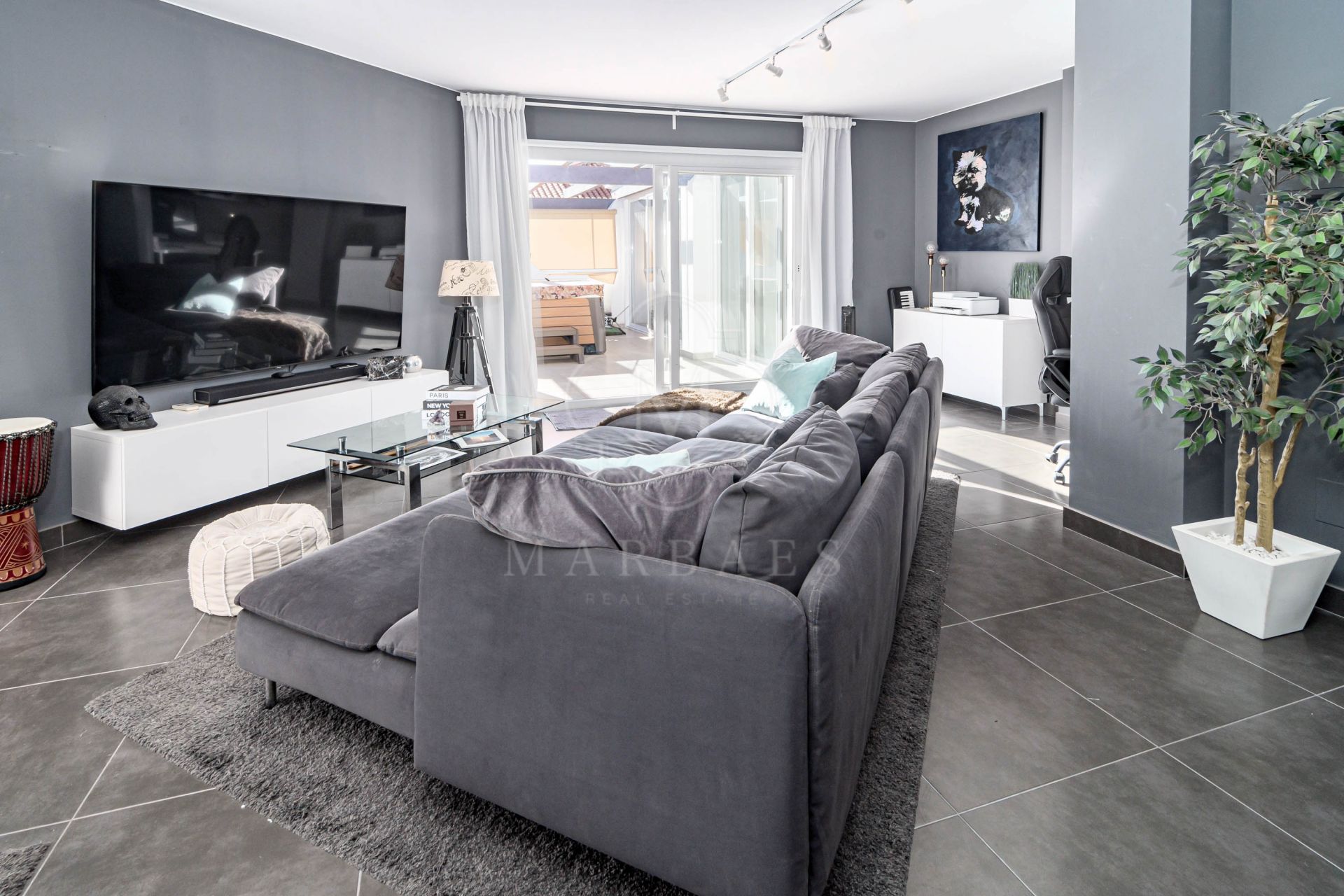La vivienda ofrece un total de 240 m², de los cuales 120 m² corresponden a una impresionante terraza pensada para disfrutar al máximo del estilo de vida mediterráneo. En este espacio exterior destaca un jacuzzi privado con capacidad para cuatro personas, acompañado de una amplia zona chill out, tumbonas y un área de barbacoa con mesa para más de seis comensales, creando el ambiente perfecto tanto para relajarse como para recibir invitados